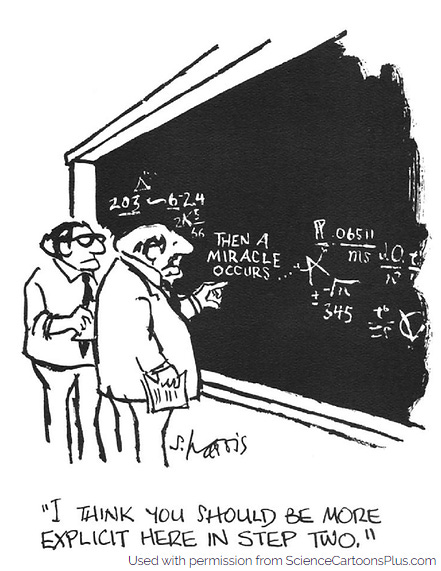 There is a famous New Yorker cartoon in which two mathematicians are standing in front of a blackboard looking at columns of equations which are separated by the statement “then a miracle occurs.” One mathematician says to the other, “I think you should be more explicit here in step two.”